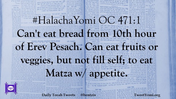 #HalachaYomi OC 471:1 Can’t eat bread from 10th hour of Erev Pesach. Can eat fruits or veggies, but not fill self; to eat Matza w/ appetite.