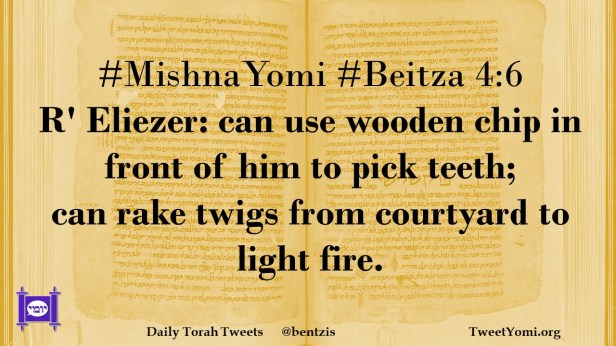 #MishnaYomi #Beitza 4:6 R’ Eliezer: can use wooden chip in front of him to pick teeth; can rake twigs from courtyard to light fire.