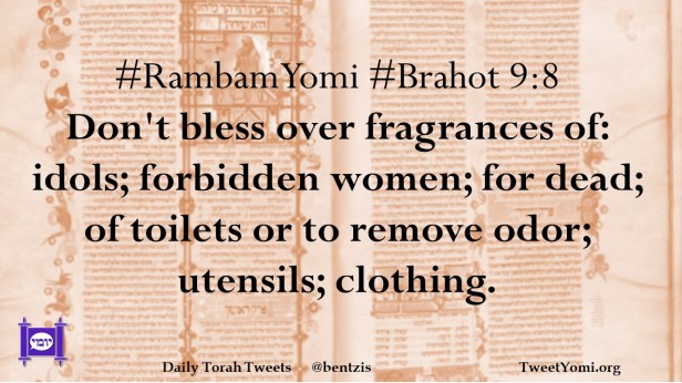 #RambamYomi #Brahot 9:8 Don’t bless over fragrances of: idols; forbidden women; for dead; of toilets or to remove odor; utensils; clothing.