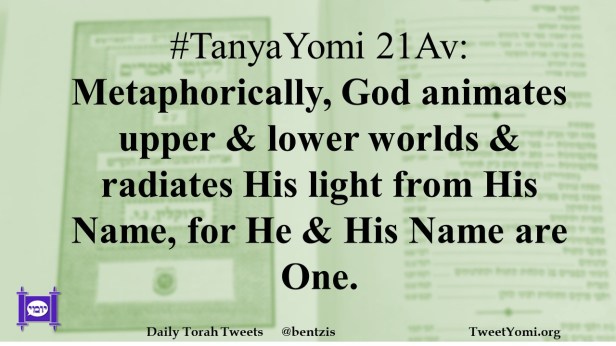 TanyaYomi 21Av: Metaphorically, God animates upper & lower worlds & radiates His light from His Name, for He & His Name are One.
