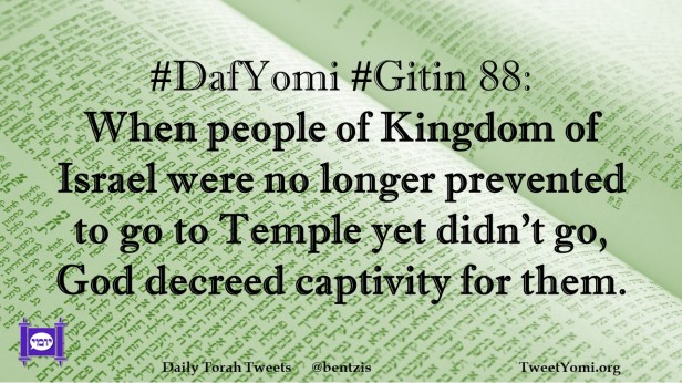DafYomi, Gitin #DafYomi #Gitin 88 Date: August 21, 2023Author: netanelspitz #DafYomi #Gitin 88: When people of Kingdom of Israel were no longer prevented to go to Temple yet didn’t go, God decreed captivity for them. Share this: Share on X (Opens in new window) X Share on Facebook (Opens in new window) Facebook Like Loading... Related