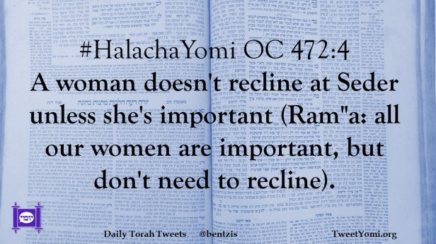 #HalachaYomi OC 472:4 A woman doesn’t recline at Seder unless she’s important (Ram”a: all our women are important, but don’t need to recline).