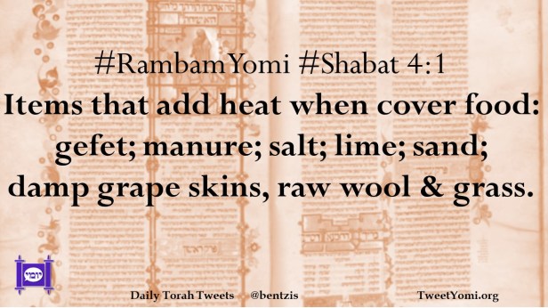 #RambamYomi #Shabat 4:1 Items that add heat when cover food: gefet; manure; salt; lime; sand; damp grape skins, raw wool & grass.