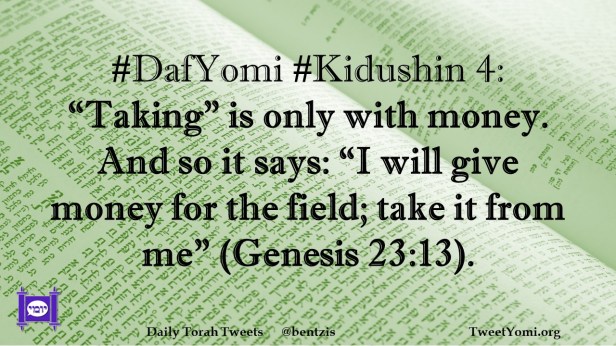 DafYomi, Kidushin #DafYomi #Kidushin 4 Date: August 23, 2023Author: netanelspitz #DafYomi #Kidushin 4: “Taking” is only with money. And so it says: “I will give money for the field; take it from me” (Genesis 23:13). Share this: Share on X (Opens in new window) X Share on Facebook (Opens in new window) Facebook Like Loading... Related