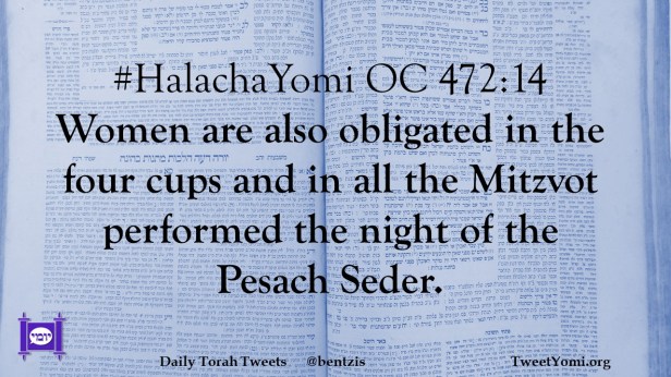 #HalachaYomi OC 472:14 Women are also obligated in the four cups and in all the Mitzvot performed the night of the Pesach Seder.