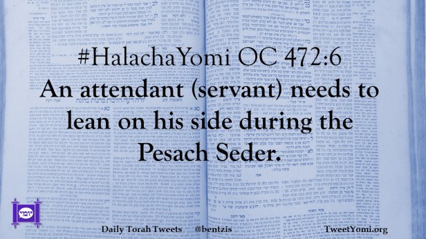 HalachaYomi #HalachaYomi OC 472:6 Date: August 23, 2023Author: netanelspitz #HalachaYomi OC 472:6 An attendant (servant) needs to lean on his side during the Pesach Seder. Share this: Share on X (Opens in new window) X Share on Facebook (Opens in new window) Facebook Like Loading... Related