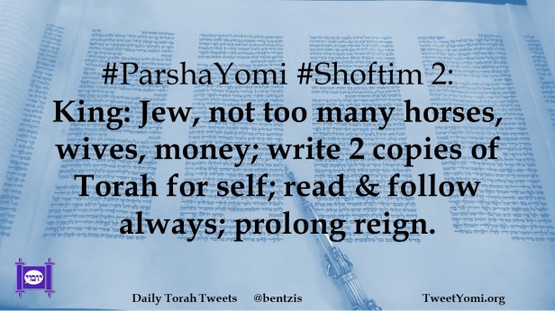 #ParshaYomi #Shoftim 2: King: Jew, not too many horses, wives, money; write 2 copies of Torah for self; read & follow always; prolong reign.