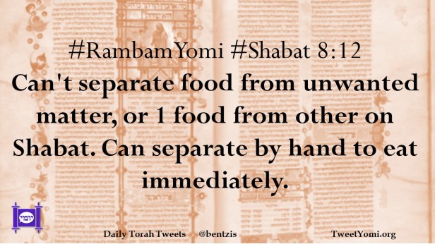 #RambamYomi #Shabat 8:12 Can’t separate food from unwanted matter, or 1 food from other on Shabat. Can separate by hand to eat immediately.