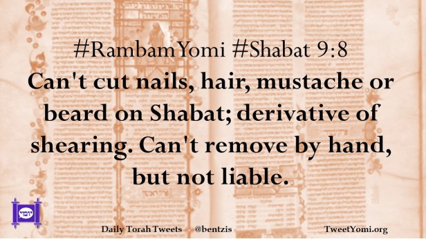 #RambamYomi #Shabat 9:8 Can’t cut nails, hair, mustache or beard on Shabat; derivative of shearing. Can’t remove by hand, but not liable.