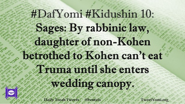 DafYomi, Kidushin #DafYomi #Kidushin 10 Date: August 29, 2023Author: netanelspitz #DafYomi #Kidushin 10: Sages: By rabbinic law, daughter of non-Kohen betrothed to Kohen can’t eat Truma until she enters wedding canopy. Share this: Share on X (Opens in new window) X Share on Facebook (Opens in new window) Facebook Like Loading... Related