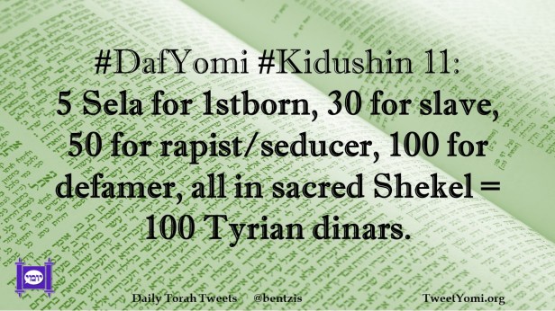 DafYomi, Kidushin #DafYomi #Kidushin 11 Date: August 29, 2023Author: netanelspitz #DafYomi #Kidushin 11: 5 Sela for 1stborn, 30 for slave, 50 for rapist/seducer, 100 for defamer, all in sacred Shekel = 100 Tyrian dinars. Share this: Share on X (Opens in new window) X Share on Facebook (Opens in new window) Facebook Like Loading... Related