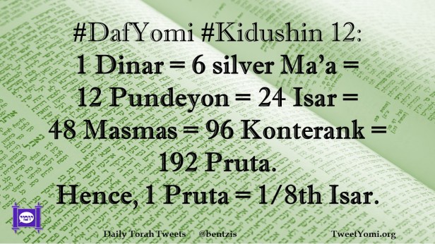 DafYomi, Kidushin #DafYomi #Kidushin 12 Date: August 29, 2023Author: netanelspitz #DafYomi #Kidushin 12: 1 Dinar = 6 silver Ma’a = 12 Pundeyon = 24 Isar = 48 Masmas = 96 Konterank = 192 Pruta. Hence, 1 Pruta = 1/8th Isar. Share this: Share on X (Opens in new window) X Share on Facebook (Opens in new window) Facebook Like Loading... Related