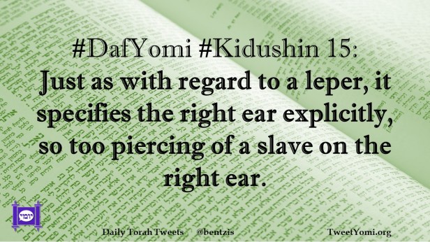 DafYomi, Kidushin #DafYomi #Kidushin 15 Date: August 29, 2023Author: netanelspitz #DafYomi #Kidushin 15: Just as with regard to a leper, it specifies the right ear explicitly, so too piercing of a slave on the right ear. Share this: Share on X (Opens in new window) X Share on Facebook (Opens in new window) Facebook Like Loading... Related