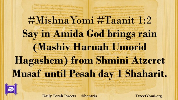 #MishnaYomi #Taanit 1:2 Say in Amida God brings rain (Mashiv Haruah Umorid Hagashem) from Shmini Atzeret Musaf until Pesah day 1 Shaharit.
