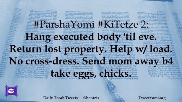 #ParshaYomi #KiTetze 2: Hang executed body ’til eve. Return lost property. Help w/ load. No cross-dress. Send mom away b4 take eggs, chicks.