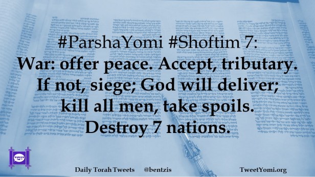 #ParshaYomi #Shoftim 7: War: offer peace. Accept, tributary. If not, siege; God will deliver; kill all men, take spoils. Destroy 7 nations.