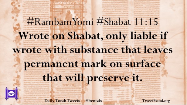 #RambamYomi #Shabat 11:15 Wrote on Shabat, only liable if wrote with substance that leaves permanent mark on surface that will preserve it.
