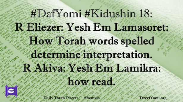 DafYomi, Kidushin #DafYomi #Kidushin 18 Date: September 7, 2023Author: netanelspitz #DafYomi #Kidushin 18: R Eliezer: Yesh Em Lamasoret: How Torah words spelled determine interpretation. R Akiva: Yesh Em Lamikra: how read. Share this: Share on X (Opens in new window) X Share on Facebook (Opens in new window) Facebook Like Loading... Related