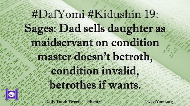 DafYomi, Kidushin #DafYomi #Kidushin 19 Date: September 7, 2023Author: netanelspitz #DafYomi #Kidushin 19: Sages: Dad sells daughter as maidservant on condition master doesn’t betroth, condition invalid, betrothes if wants. Share this: Share on X (Opens in new window) X Share on Facebook (Opens in new window) Facebook Like Loading... Related