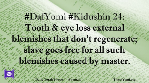 DafYomi, Kidushin #DafYomi #Kidushin 24 Date: September 7, 2023Author: netanelspitz #DafYomi #Kidushin 24: Tooth & eye loss external blemishes that don’t regenerate; slave goes free for all such blemishes caused by master. Share this: Share on X (Opens in new window) X Share on Facebook (Opens in new window) Facebook Like Loading... Related