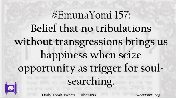 #EmunaYomi 157: Belief that no tribulations without transgressions brings us happiness when seize opportunity as trigger for soul-searching.