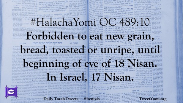 #HalachaYomi OC 489:10 Forbidden to eat new grain, bread, toasted or unripe, until beginning of eve of 18 Nisan. In Israel, 17 Nisan.