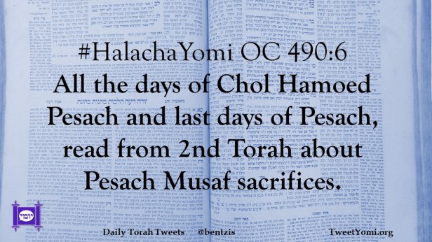 #HalachaYomi OC 490:6 All the days of Chol Hamoed Pesach and last days of Pesach, read from 2nd Torah about Pesach Musaf sacrifices.