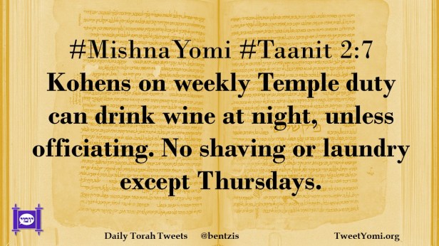 #MishnaYomi #Taanit 2:7 Kohens on weekly Temple duty can drink wine at night, unless officiating. No shaving or laundry except Thursdays.