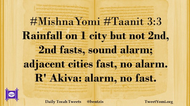 #MishnaYomi #Taanit 3:3 Rainfall on 1 city but not 2nd, 2nd fasts, sound alarm; adjacent cities fast, no alarm. R’ Akiva: alarm, no fast.