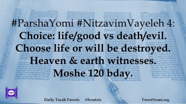 #ParshaYomi #NitzavimVayeleh 4: Choice: life/good vs death/evil. Choose life or will be destroyed. Heaven & earth witnesses. Moshe 120 bday.