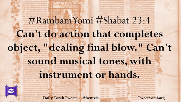 #RambamYomi #Shabat 23:4 Can’t do action that completes object, “dealing final blow.” Can’t sound musical tones, with instrument or hands.