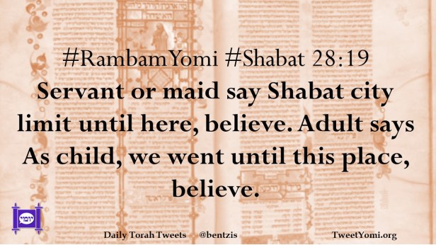 #RambamYomi #Shabat 28:19 Servant or maid say Shabat city limit until here, believe. Adult says As child, we went until this place, believe.