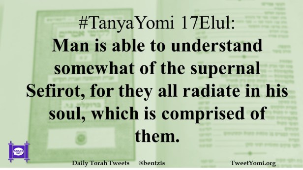 #TanyaYomi 17Elul: Man is able to understand somewhat of the supernal Sefirot, for they all radiate in his soul, which is comprised of them.