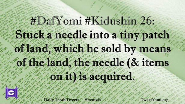 DafYomi, Kidushin #DafYomi #Kidushin 26 Date: September 15, 2023Author: netanelspitz #DafYomi #Kidushin 26: Stuck a needle into a tiny patch of land, which he sold by means of the land, the needle (& items on it) is acquired. Share this: Share on X (Opens in new window) X Share on Facebook (Opens in new window) Facebook Like Loading... Related