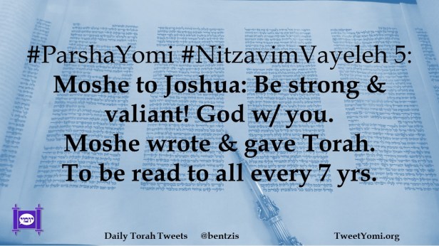 #ParshaYomi #NitzavimVayeleh 5: Moshe to Joshua: Be strong & valiant! God w/ you. Moshe wrote & gave Torah. To be read to all every 7 yrs.