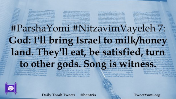 #ParshaYomi #NitzavimVayeleh 7: God: I’ll bring Israel to milk/honey land. They’ll eat, be satisfied, turn to other gods. Song is witness.
