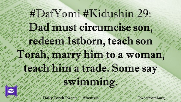 DafYomi, Kidushin #DafYomi #Kidushin 29 Date: September 28, 2023Author: netanelspitz #DafYomi #Kidushin 29: Dad must circumcise son, redeem 1stborn, teach son Torah, marry him to a woman, teach him a trade. Some say swimming. Share this: Share on X (Opens in new window) X Share on Facebook (Opens in new window) Facebook Like Loading... Related