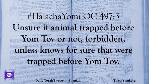 #HalachaYomi OC 497:3 Unsure if animal trapped before Yom Tov or not, forbidden, unless knows for sure that were trapped before Yom Tov.