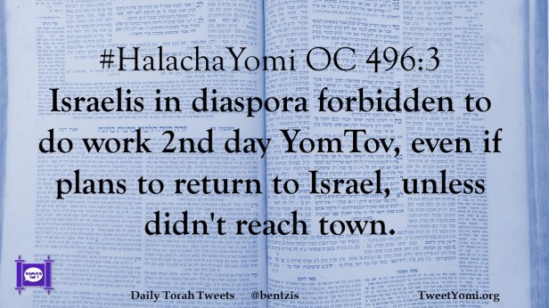 #HalachaYomi OC 496:3 Israelis in diaspora forbidden to do work 2nd day YomTov, even if plans to return to Israel, unless didn’t reach town.