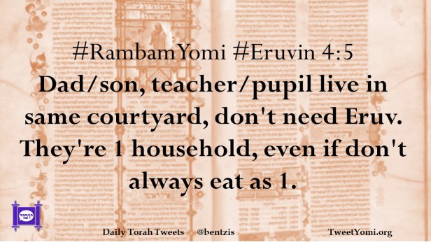 #RambamYomi #Eruvin 4:5 Dad/son, teacher/pupil live in same courtyard, don’t need Eruv. They’re 1 household, even if don’t always eat as 1.