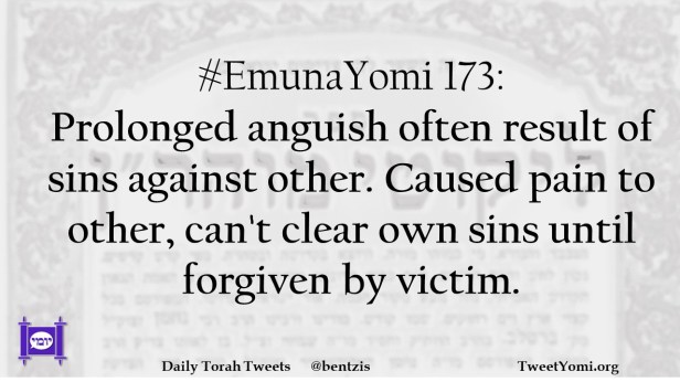 #EmunaYomi 173: Prolonged anguish often result of sins against other. Caused pain to other, can’t clear own sins until forgiven by victim.