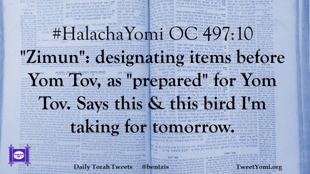 #HalachaYomi OC 497:10 “Zimun”: designating items before Yom Tov, as “prepared” for Yom Tov. Says this & this bird I’m taking for tomorrow.
