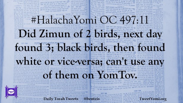 #HalachaYomi OC 497:11 Did Zimun of 2 birds, next day found 3; black birds, then found white or vice-versa; can’t use any of them on YomTov.