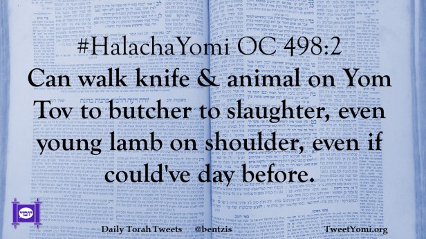 #HalachaYomi OC 498:2 Can walk knife & animal on Yom Tov to butcher to slaughter, even young lamb on shoulder, even if could’ve day before.