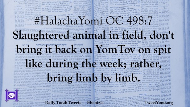 #HalachaYomi OC 498:7 Slaughtered animal in field, don’t bring it back on YomTov on spit like during the week; rather, bring limb by limb.