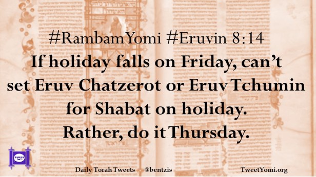 #RambamYomi #Eruvin 8:14 If holiday falls on Friday, can’t set Eruv Chatzerot or Eruv Tchumin for Shabat on holiday. Rather, do it Thursday.
