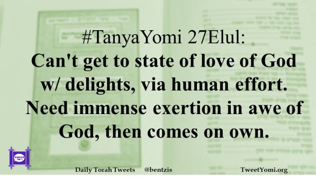 #TanyaYomi 27Elul: Can’t get to state of love of God w/ delights, via human effort. Need immense exertion in awe of God, then comes on own.