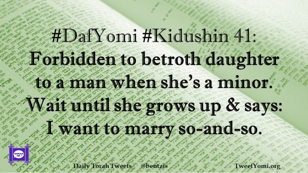 DafYomi, Kidushin #DafYomi #Kidushin 41 Date: October 6, 2023Author: netanelspitz #DafYomi #Kidushin 41: Forbidden to betroth daughter to a man when she’s a minor. Wait until she grows up & says: I want to marry so-and-so. Share this: Share on X (Opens in new window) X Share on Facebook (Opens in new window) Facebook Like Loading... Related