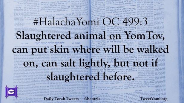 #HalachaYomi OC 499:3 Slaughtered animal on YomTov, can put skin where will be walked on, can salt lightly, but not if slaughtered before.