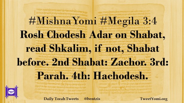 #MishnaYomi #Megila 3:4 Rosh Chodesh Adar on Shabat, read Shkalim, if not, Shabat before. 2nd Shabat: Zachor. 3rd: Parah. 4th: Hachodesh.